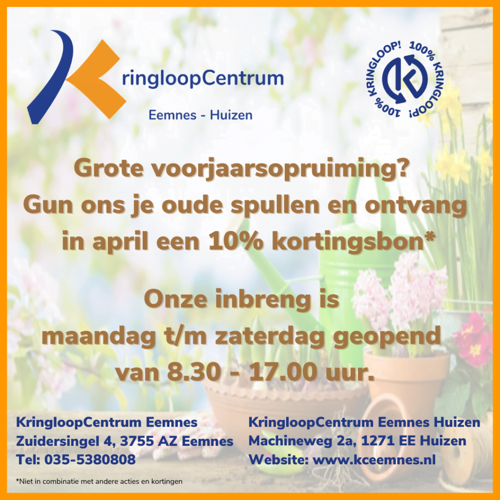 Grote voorjaarsopruiming? Gun ons je oude spullen en ontvang in april een 10% kortingsbon*. Onze inbreng is maandag t/m zaterdag geopend van 8.30 – 17.00 uur.