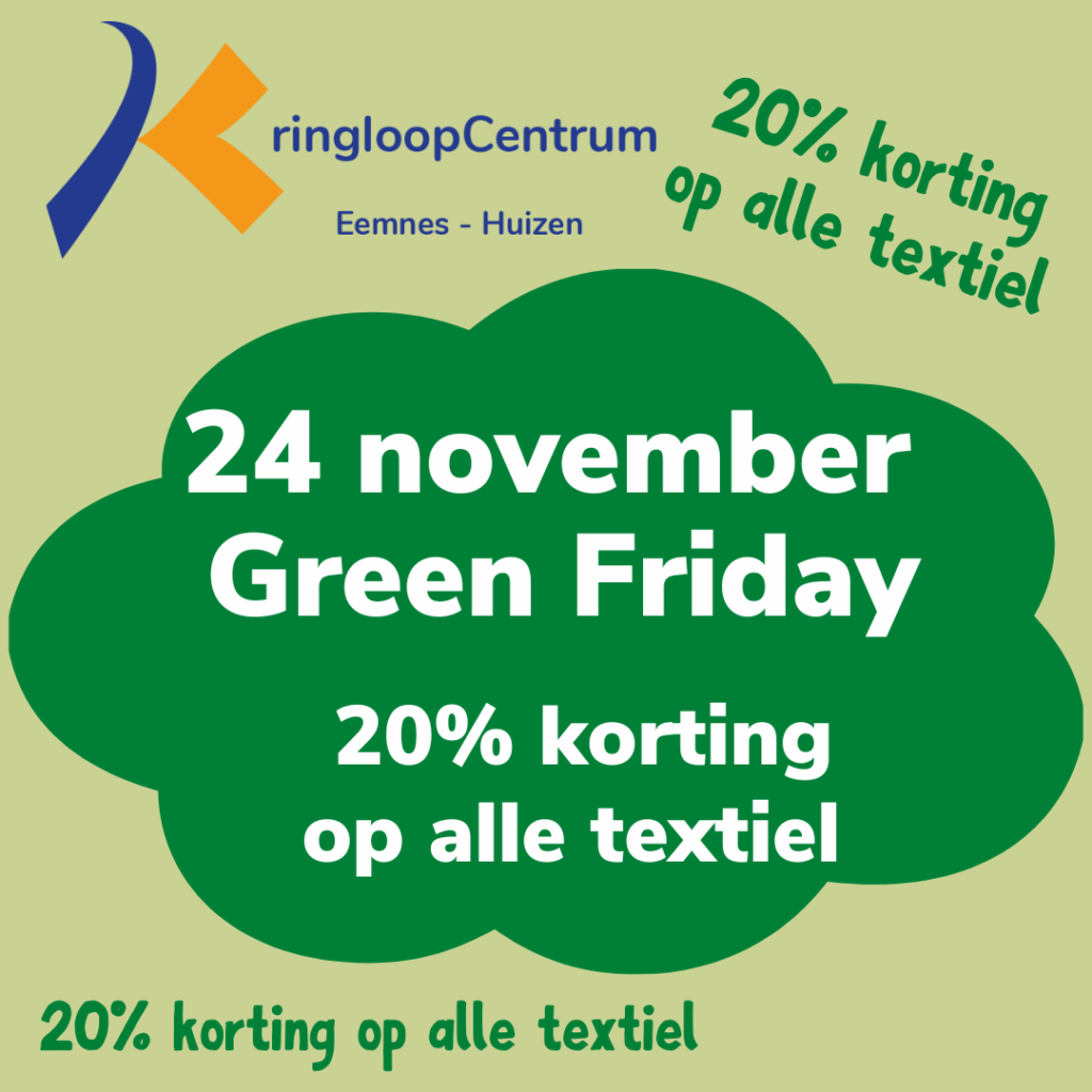 Vrijdag 24 november is het bij ons weer Green Friday! En hebben wij op al ons textiel 20% korting deze dag. Dus wees er snel bij!!